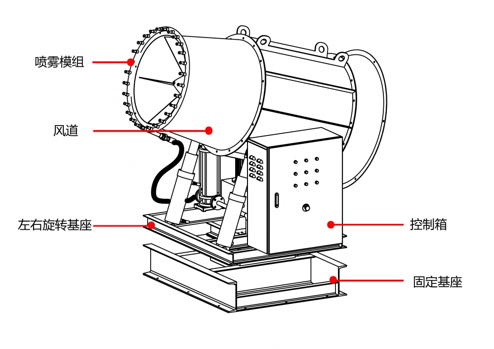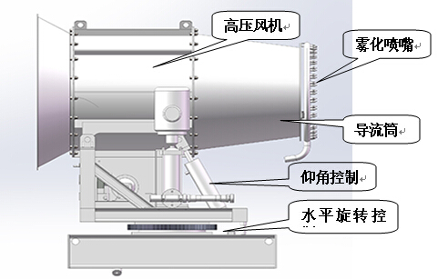 雾炮机 主要由电机、高压风机、水平旋转装置、仰角控制装置、导流筒、雾化喷嘴、高压泵、储水箱。 1、 增压装置有电机和压力机组合一起,作用是利用电机动力推动高压泵把储水箱的水吸入并进行加压后输出,输送到喷头。 2、 强风导流装置有风机和风力导流筒组成,作用是把风机的强风气流集合定向并强力